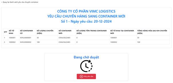 Yêu cầu chuyển tàu mới thêm sẽ ở trạng thái đang chờ duyệt, doanh nghiệp có thể chọn “Hủy yêu cầu”