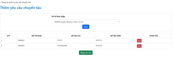 Doanh nghiệp có thể chọn nhiều tờ khai để chuyển tàu. Sau khi hoàn thành việc chọn, nhấn nút “Nhập yêu cầu” để thêm yêu cầu chuyển tàu