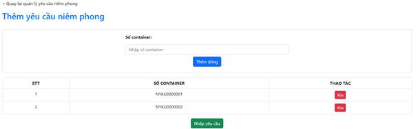 Doanh nghiệp nhập số container cần niêm phong từ ô chọn và ấn nút “Thêm dòng”, doanh nghiệp có thể thêm nhiều container để yêu cầu niêm phong. Sau khi hoàn thành việc chọn, nhấn nút “Nhập yêu cầu” để thêm yêu cầu kiểm tra